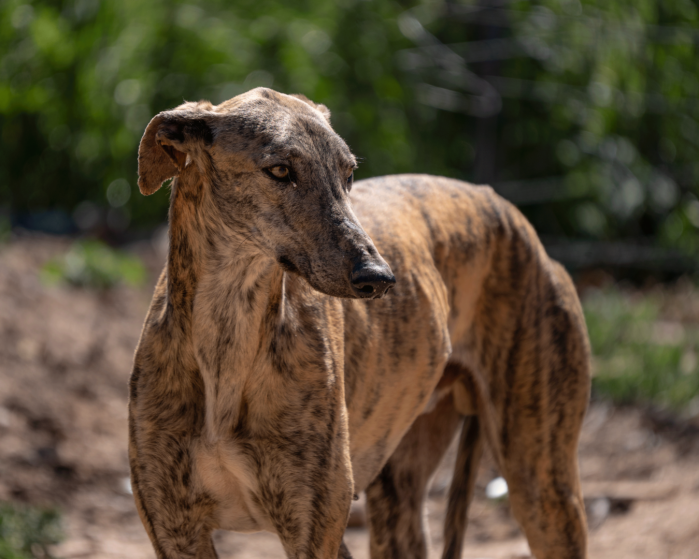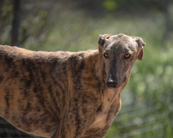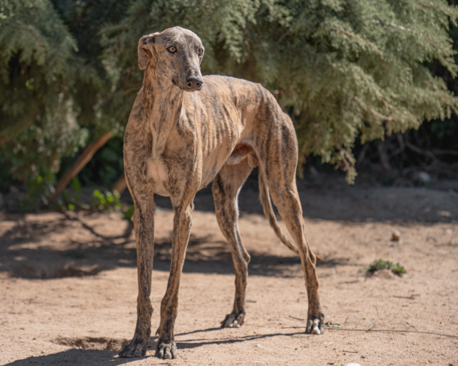 Huracan es un galgo desahuciado por un galguero que esta en el Refugio desde febrero del 26. Bien adaptado a la convivencia con mas perros.